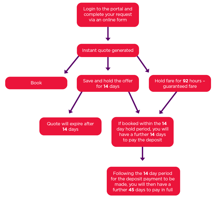 No hold times, no turnaround times, speed to market here is key! The Group Sales Optimiser tool will enable you to login to the portal, complete your request via an online form and receive an instant quote. You will then have the option to book, or alternatively. save and hold the quote for 14 days prior to booking. See below for more details on the booking process: